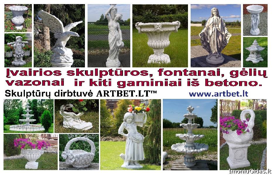 Veiklos sritys: Veiklos aprašymas: Skulptūrų dirbtuvė ARTBET.LT Lauko skulptūros, gėlių vazonai, fontanai ir kiti gaminiai iš betono. Dekoratyviniai sodo bei namų aplinkos betoniniai gaminiai. Gaminame pagal išankstinius užsakymus! Šalčininkai. ☎861855966. www.artbet.lt | |||||||||||||||