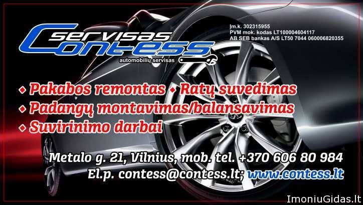 Veiklos sritys: Veiklos aprašymas: UAB “Contess” tai specializuotas lengvųjų automobilių bei mikroautobusų servisas įkurtas 2009 m. Pas mus jūs galite pasitikrinti pakabą ir vietoje įsigyti ir pakeisti sugadintas detales, bei padaryti geometrinį ratų suvedimą. Taip pat mūsų autoservise jūs galite permontuoti ir subalansuoti padangas. Mūsų naudojama įranga: Dviejų kolonų keltuvas ECON III 3.0 t.; Ašių geometrijos prietaisas VISUALINIR 501; Ašies pakėlimo keltuvas 542R; Automobilių padangų montavimo staklės T3000; Automobilių ratų balansavimo stendas B9455; Ašių laisvumo detektorius ‚SILVER M1‘; Taip pat prekiaujame LIQUI MOLY alyva motociklams. Dėl registracijos ir kitų atliekamų darbų teirautis telefonu: +370 606 80984.AKCIJA! Užsakius automobilio pakabos remonto darbus sumai nuo 100-300 Lt, ratų geometrija Jums kainuos tik 25 Lt, o jei suma viršys 300 Lt – ratų geometriją padarysim NEMOKAMAI | |||||||||||||||