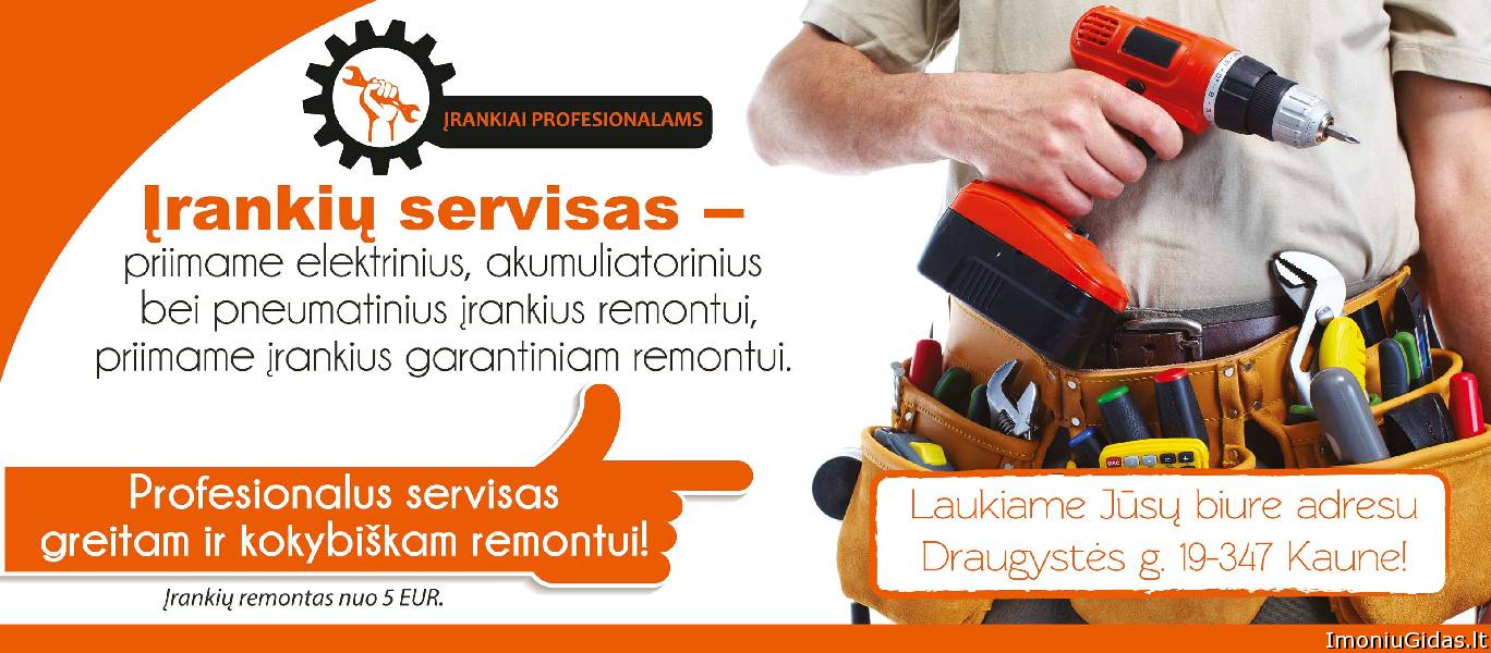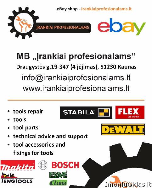 Veiklos aprašymas: Didmeninė ir mažmeninė prekyba elektriniais, akumuliatoriniais įrankiais ir detalėmis. Aksesuarai, priedai. Prekyba prekės ženklų Makita, Hitachi, Wera, Milwaukee, Bosch, Stihl, Stabila, Dewalt, Luna, Essve, Teng Tools, Limit produkcija. Galime pasiūlyti darbo drabužių, oro kompresorių, suvirinimo įrangos, detalių įrankių remontui. Įmonė teikia benzininių, akumuliatorinių, elektrinių, pneumatinių ir kt. įrankių remonto paslaugą. Įrankių defektacija (gedimo nustatymas) - NEMOKAMAI. Išrašome PVM sąskaitas už pirkinius ir remontą. Remontuojame Makita Bosch Dewalt Hilti Hitachi Metabo Flex Milwaukee Rems Ryobi Eibenstock Blaukraft Asaki Meec Black and Decker Elektro Beckum Pneutek Skil bei daug kitų prekinių ženklų įrankius. Įrankių defektavimas (gedimo nustatymas, išardymas) NIEKO NEKAINUOJA! +37060486179 +37067165625 | |||||||||||||||