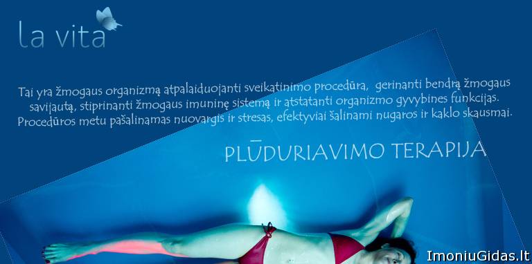 Veiklos aprašymas: Plūduriavimo procedūra – tai žmogaus organizmą atpalaiduojanti sveikatinimo procedūra, gerinanti bendrą žmogaus savijautą, stiprinanti žmogaus imuninę sistemą ir atstatanti organizmo gyvybines funkcijas. Procedūros metu pašalinamas nuovargis ir stresas, efektyviai šalinami nugaros ir kaklo skausmai. Labai tinkama giliai meditacijai. Plūduriavimo terapijos procedūra yra vienintelė procedūra, kuri suteikia naujus pojūčius bei leidžia pajusti nesvarumo būseną. | |||||||||||||