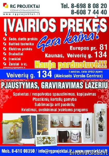 Veiklos aprašymas: "RG Projektai" atliekamos paslaugos: graviravimas, pjaustymas lazeriu, spalvotas spausdinimas, kopijavimas, iškabų gamyba, automobilių apklijavimas, dizaino ir spaudos darbai. Originalių dovanų įvairioms progoms gamyba ir prekyba. Sveikinimai, kvietimai įvairioms progoms. Prekiaujame pigia buitine technika, įrankiais, lauko baldais, žaislais, sodo, daržo, elektros prekėmis. | |||||||||||||||
