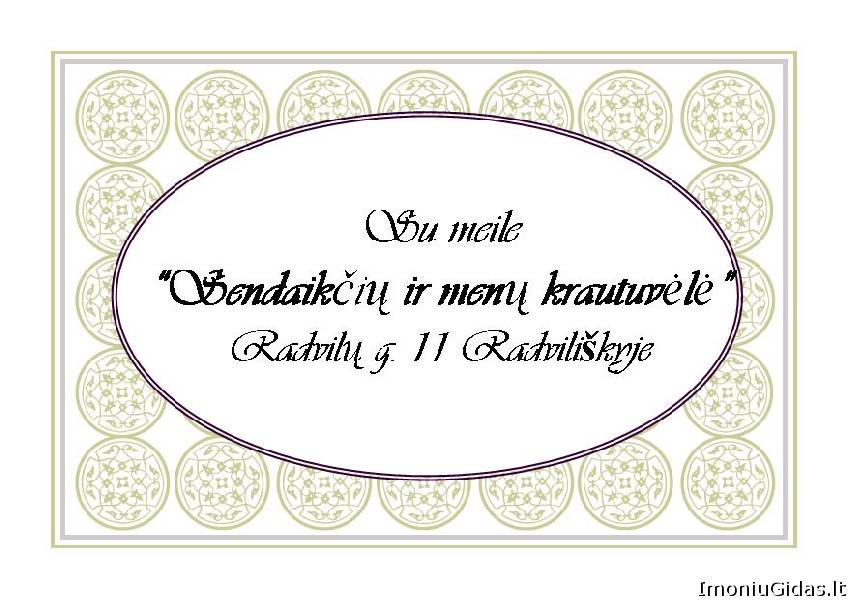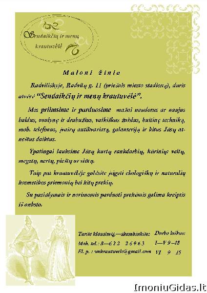 Veiklos aprašymas: Radviliškyje, Radvilų g. 11 (priešais miesto stadioną), duris atvėrė “Sendaikčių ir menų krautuvėlė”, kurioje galite įsigyti naujus ir mažai naudotus baldus, avalynę ir drabužius, vaikiškus žaislus, kokybišką buitinę techniką, mob. telefonus, įvairų antikvariatą, sendaikčius, galanteriją ir daugybę kitų daiktų. Taip pat krautuvėlėje galėsite įsigyti ekologiškų ir naturalių kosmetikos ir buities priemonių, kurtų rankdarbių. Krautuvėlė dirba komiso pagrindais. | |||||||||||||