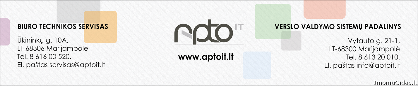 Veiklos aprašymas: Įmonė „Apto IT“ yra Microsoft sertifikuotas partneris. Ją sudaro du savarankiški padaliniai: biuro technikos servisas ir verslo valdymo sistemų padalinys. „Apto IT“ servisas teikia įvairiapusiškas biuro technikos aptarnavimo paslaugas. Remontuoja ir aptarnauja kopijavimo aparatus, spausdintuvus, kompiuterius, pildo spausdintuvų kasetes, parduoda įvairią biuro, kompiuterinę techniką, spausdintuvus, jų detales ir eksploatacines medžiagas. Parduotuvėje turime platų spausdinimo kasečių ir rašaliniams spausdintuvams asortimentą. Serviso klientai yra tiek didžiausios Marijampolės regiono įmonės ir įstaigos, tiek mažos įmonės bei gyventojai. „Apto IT“ programavimo skyrius teikia Verslo Valdymo Sistemų diegimo, konsultavimo ir programavimo paslaugas. Didžiausia dalis paslaugų tenka Microsoft Dynamics NAV vartotojams, ne tik Lietuvoje, bet ir Latvijoje, Estijoje ir Lenkijoje. | |||||||||||||||