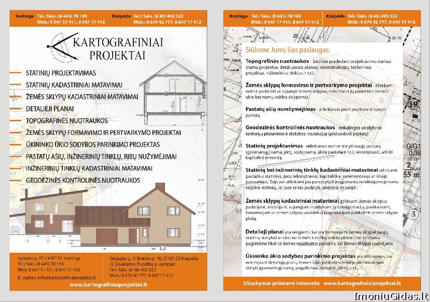 Veiklos sritys: Veiklos aprašymas: Geodezija ir žemėtvarka • Žemės sklypų ribų planų sudarymas (kadastriniai žemės sklypų matavimai); • Žemės sklypų ribų nužymėjimas; • Žemės sklypų padalinimo bei jungimo projektų rengimas; • Geodezinių-topografinių nuotraukų sudarymas; • Geodeziniai darbai statybos aikštelėse; • Požeminių komunikacijų kontrolinių, geodezinių nuotraukų sudarymas; • Projektuojamų pastatų ir statinių ašių nužymėjimas; • Niveliacija; • Kelių ašių nužymėjimas; • Konsultacijos Statinių ir inžinierinių tinklų inventorizacija • Pastatų, statinių ir patalpų kadastriniai matavimai (inventorizacija); • Inžinerinių tinklų kadastriniai matavimai (inventorizacija); • Konsultacijos. Architektūra ir detalieji planai Žemės sklypo planų prilygintų detaliajam planui darymas. • Detaliųjų planų sudarymas; • Ūkininko ūkio sodybos formavimas • Specialiųjų planų sudarymas; • Statinių projektavimas. • Konsultacijos | |||||||||||