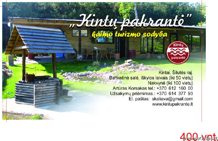 Veiklos aprašymas: Poilsio ir laisvalaikio centras „Kintų pakrantė“ įkurtas 2007 m. gegužės mėn. Esame įsikūrę 3,5 ha. teritorijos plote pačiuose Kintuose, palei Kuršių marių pakrantę. Poilsis prie Kuršių marių, Kintų miestelyje stovyklavietė - kempingas, Nemuno Deltos regioniniame parke (Šilutės raj), kviečia visus norinčius į gamtą pailsėti. Stovyklavietėje yra 2, 3, 6-viečiai nameliai, 1 didelis namas su sale pobūviams. Priimame poilsiautojus su palapinėmis ir kemperiais. Sporto ir vaikų žaidimų aikštelė,laukinė didelė scena muzikantams,aparatūros nuoma švenčių įgarsinimui,laivai kurie plugdo po Kursių Marias, Nemuno Deltą, iki 50zmoniu, viskas ko reikia Jūsų vaikams ir norintiems aktyvaus poilsio. Stovyklavietėje yra apie 100 stacionarių miegamų vietų,didele teritorija, todėl tinka sąskrydžiams, sporto renginiams,giminių susitikimams, vestuvėms, sventėms ir t.t laukiame jusų! Kaimo turizmo sodyba „Kintų pakrantė“ teikia sias paslaugas: maitinimo, apgyvendinimo, pramoginių- žvejybinių laivų nuoma, autobuso- limuzino nuoma. Lietuviškoji Venecija (Minijos kaimas) ten įsikūręs mūsų uostas. Visai netoli triukšmingos Palangos, šurmuliuojančios Nidos, šalia Nemuno žiočių yra nuostabaus grožio kaimelis Minija. Dėl savo unikalaus kraštovaizdžio dar vadinamas „Lietuviškąja Venecija“. Tai senas žvejų kaimas, per kurio vidurį teka Minijos upė. Tiltų nėra. Norint patekti į kitą kaimo pusę, teks keltis vandeniu arba daryti bene dešimties kilometrų lankstą sausuma. Kaimo vardas minimas nuo XIV a. vidurio ir kilęs nuo Minijos upės pavadinimo. Pagal senųjų kapų užrašus galima spręsti, kad anksčiau kaimas buvo vadinamas Mine arba Minge. Pastarasis pavadinimas populiarus ir mūsų dienomis. Šiandien Minija žvejų ir ramaus poilsio mėgėjų rojus. Nuolatinių gyventojų čia telikę vos keletas sodybų. Plaukiojant po Nemuno deltą, atsiveria įspūdingi vaizdai...Rusnės sala, Ventės ragas, Krokų Lankų ežeras, tolumoje baltuoja Nidos kopos...nejučia imi galvoti kokia graži ta mūsų Lietuva...Nemuno deltos regioninis parkas garsėja augalų ir paukščių įvairove, retomis ir nykstančiomis gyvūnų rūšimis. MALONIAI KVIEČIAME APSILANKYTI Kaimo turizmo sodyba „Kintų pakrantė“ KINTAI, ŠILUTĖS RAJONAS Tel.: 861437793; 861216000 Informacijos tel.visą parą 861437793 el.p. skaliava@gmail.com www.kintupakrante.lt | |||||||||||||