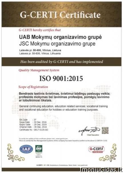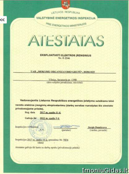 Veiklos aprašymas: Mokymų organizavimo grupė siūlo sprendimus, susijusius su jūsų darbuotojų mokymais, darbuotojų kvalifikacijos kėlimu ir tobulėjimu, personalo, vadovų atestavimu, sudaro galimybes papildyti anksčiau įgytas žinias. Pagrindinės mokymų sritys: - SPSC ypatingųjų statinių kvalifikacijos atestatai; - Energetika ( elektros, šilumos ūkio, dujų ir naftos įmonių darbuotojų mokymas); - Transportas (profesinis vairuotojų mokymas (95 kodas), krautuvų vairuotojų mokymas, autoserviso personalo mokymas); - Darbuotojų sauga ir sveikata (specialistų, atsakingų asmenų, vadovų mokymas); - Vadyba (administracijos darbuotojų, pardavėjų,vadybininkų, klientų aptarnavimo specialistų mokymas); - Kvalifikacijos kėlimo seminarai pagal LR Aplinkos ministerijios reikalavimus; - Valstybės tarnautojų mokymas; - Kitas mokymas. Pagrindinės paslaugos: - Pilnas įmonės darbuotojų saugos ir sveikatos, gaisrinės saugos ir saugos nuo elektros auditas; - Įmonės darbuotojų saugos ir sveikatos tarnybos funkcijų vykdymas; Darbuotojų saugos ir sveikatos dokumentacijos rengimas; - Specialisto, atsakingo už įmonės elektros ūkį funkcijų vykdymas; - Reikalingų žurnalų, blankų, ženklų asmeninių apsaugos priemonių teikimas; - Įmonės vadovų ir darbuotojų konsultavimas. | |||||||||||||