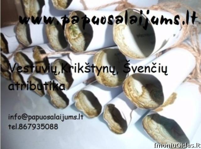 Veiklos aprašymas: Gaminame vestuvinę, proginę, krikštynų, bernvakarių, mergvakarių atributika lietuvių, lenkų kalbomis: etiketes, lenkų lietuvių ar rusų kalbomis, su sveikinimais, maketuojama su pageidaujamomis nuotraukomis, tai pat stalo korteles, nominacijų korteles, sveikinimų knygas, kvietimus, padėkas, vestuvių ar krikštynų laikraščius, pinigus su nuotraukomis, diplomus, instrukcijas, santuokos liudijimus, rašomi scenarijai lietuvių, lenkų, rusų arba lietuvių – lenkų kalbomis puošiame taures ir butelius, gaminame vestuvinius meniu, įvairius kalendorius skirtus visom progom, salės dekoracijas... Gaminami rankų darbo medaliai mediniu pagrindu vestuvių apdovanojimams. Galima užsakyti ir medalius pagal savo išsirinkta nominacija. Taip pat priimami individualūs užsakymai vestuvių atributikai. Neradote kas Jums tiktų? Rašykite - pagaminsime. Kviečiame apsilankyti mūsų elektroninėje parduotuvėje www.papuosalaijums.lt arba kreiptis el. paštu: info@papuosalaijums.lt tel. nr. 867935088 | |||||||||||||