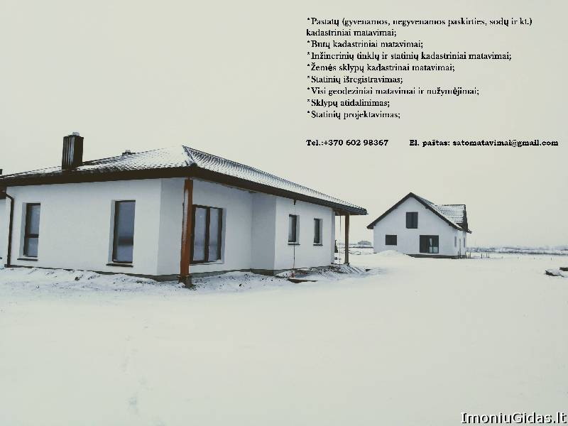 Veiklos sritys: Veiklos aprašymas: Atliekame sklypų, statinių kadastrinius matavimus, sklypų kadastrinių duomenų atnaujinimą, braižome topografinias nuotraukas, inžinerinių tinklų planus, statinių geodezinius planus, projektuojame pastatus ir žemės sklypus! | |||||||||||||