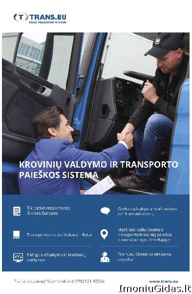 Veiklos sritys: Veiklos aprašymas: Krovinių ir transporto birža Trans.eu Sistemoje suteikia pastovią prieigą prie laisvų transporto ir krovinių pasiūlymų iš beveik 30 tūkst. patikrintų įmonių iš visos Europos. Patogus įrankis palengvinantis kasdienį darbą ekspeditoriams, vežėjams, transporto ir gamybos įmonėms. | |||||||||||||