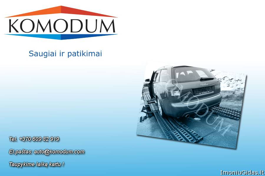 Veiklos sritys: Veiklos aprašymas: KOMODUM – teikia transporto paslaugas visoje Lietuvoje, Europoje, Rusijoje, Baltarusijoje. Pagrindinė veikla – automobilių gabenimas. Reguliariai gabename automobilius autovežiais. Surenkame pavienius automobilius, nupirktus internetu. Konsultuojame pirmą kartą perkančius. Automobilių gabenimo paslaugas atliekame turėdami daug patirties. Gabename naujus ir naudotus automobilius. Atliekame tarptautinius projektus, kurių metu autovežiais yra gabenami itin brangūs automobiliai. Autovežiai yra pritaikyti gabenti nuo 1 iki 9 automobilių. Vairuotojai yra apmokomi kaip saugiai ir patikimai atlikti krovos darbus, pritivirtinti automobilį. Gabendami automobilius laikomės visų saugos reikalavimų, todėl Klientams siūlome laiku ir saugiai pristatyti automobilį. Dirbame su kelionių agentūromis visoje Europoje. Važiuodami pailsėti, pasiimkite savo automobilį kartu. | |||||||||||||