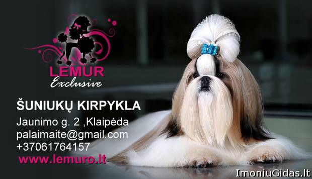 Veiklos sritys: Veiklos aprašymas: Šunų kirpykla Profesionalus šunų kirpimas. Šuniukų kirpykloje UAB "Lemur Exclusive" teikiamos visos grožio paslaugos jūsų augintiniui. Kirpėjos turinčios ilgalaikę patirtį , mokėsi Amerikoje, pastoviai dalyvauja kirpimo seminaruose ir šunų parodose, pačios augina ir veisia šunis , kurių šunys pastoviai laimi parodose. Registracija tel. : +37061764157 | |||||||||||