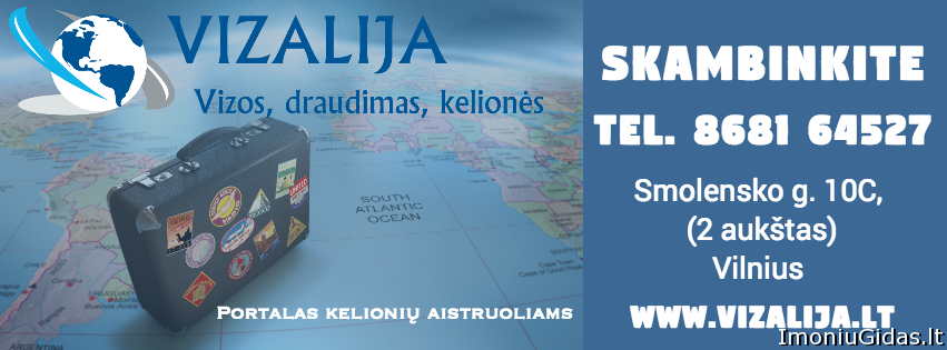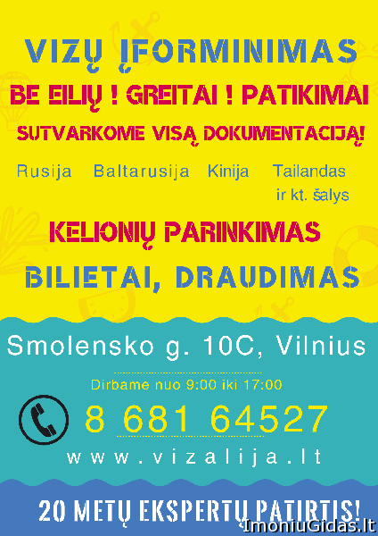 Veiklos sritys: Veiklos aprašymas: Mūsų komandą sudaro ekspertai, sukaupę 20 metų vertingą patirtį vizų įforminimo ir turizmo paslaugų srityje, todėl esame pasiruošę išspręsti net sudėtingiausią Jūsų situaciją. Forminame VIZAS į Rusiją, Baltarusiją, Kiniją, Tailandą, Uzbekistaną ir kt. šalis. KELIONIŲ pasiūlymų parinkimas pagal pageidavimus. Aviabilietai, autobusų BILIETAI, apgyvendinimas. | |||||||||||||||
