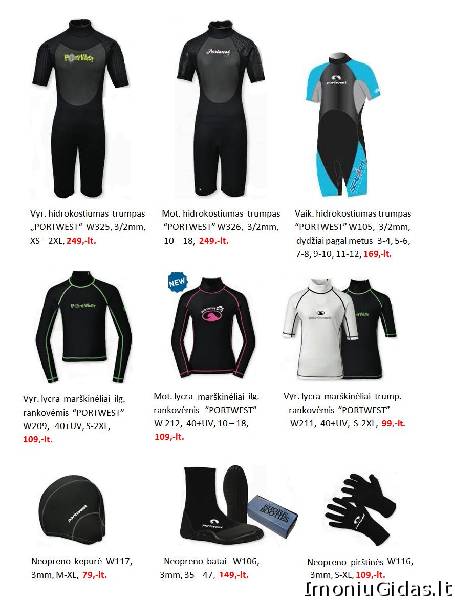 Veiklos sritys: Veiklos aprašymas: Nuolat prekiaujame įvairiais hidrokostiumais ir jų priedais, gelbėjimosi lemenėmis, slidinėjimo apranga bei aktyviam laisvalaikiui skirta apranga. | |||||||||||||||